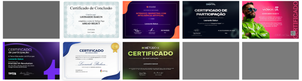 Formação em Meta Ads (2016 e 2026), Google Ads (2016 e 2026) e Design Gráfico (2009-2010 Sesc), com domínio de plataformas de IA para criação de fotos, vídeos e textos (2026); além de mentorias estratégicas em marketing.
